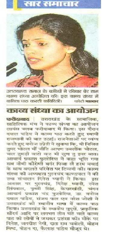 फरीदाबादः हरियाणा दिनाॅंक 19 जुलाई, रविवार 2009 को लायन्स क्लब फरीदाबाद में साहित्यिक संस्था अंज्वाल के सौजन्य से गढ़वाली कुमाउंनी कवि सम्मेलन का आयोजन किया गया। कवि सम्मेलन की विशेषता यह रही कि पुराने कवियों के साथ-साथ नवोदित कवियों को भी अपनी कवितापाठ करने का अवसर दिया गया। आयोजकों का कहना था कि नवोदत कवियों को भी उचित मंच मुहैया किया जाना चाहिए।