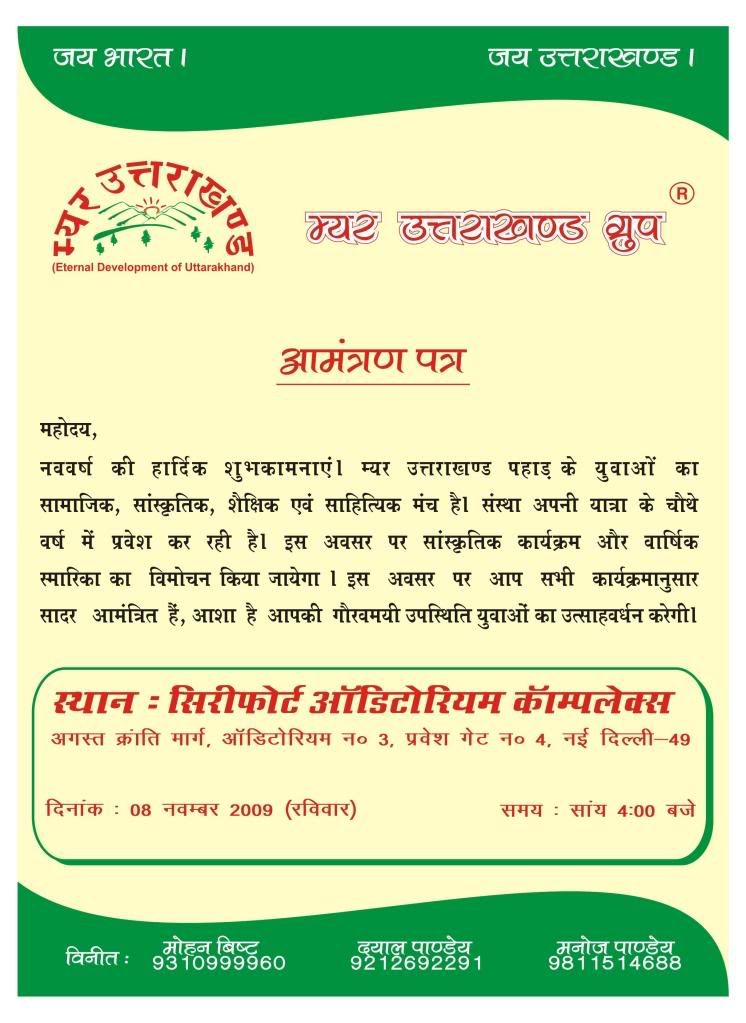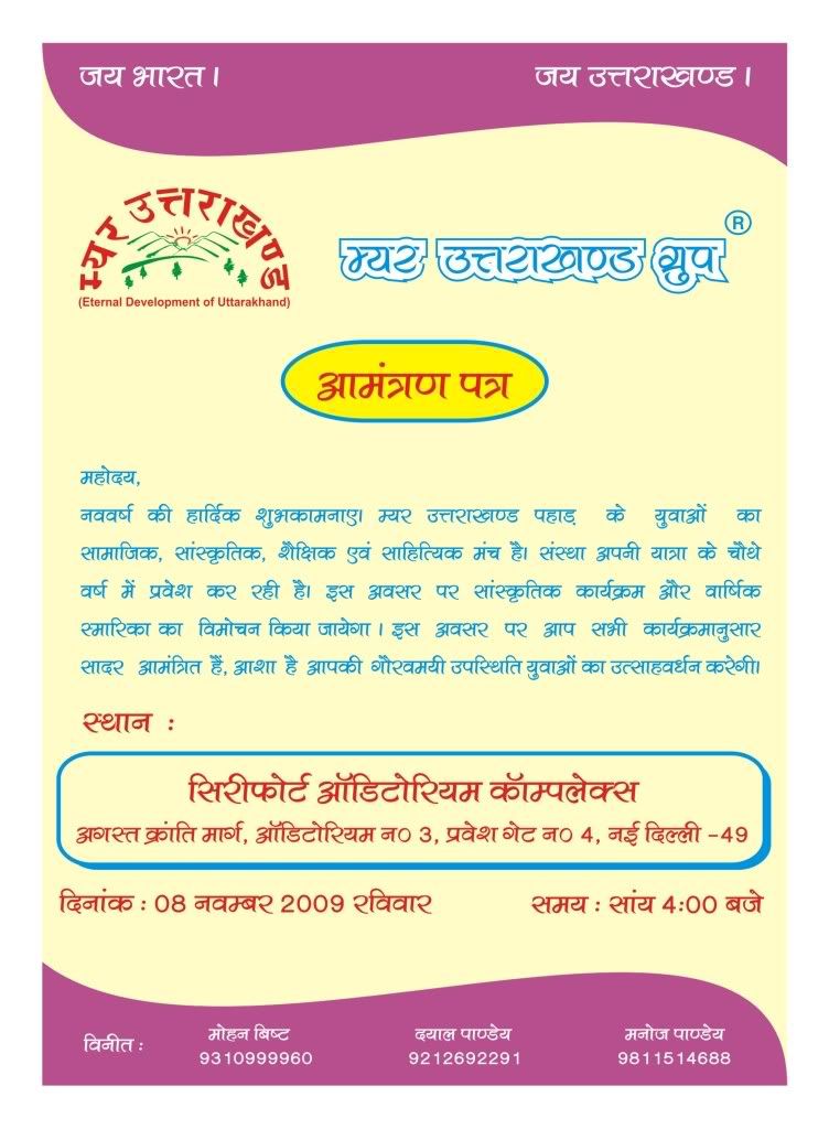 जैसा की आप सभी लोग जानते हैं, म्यर उत्तराखंड पहाड़ से जुड़े हुए युवाओं का एक संगठन है, जो समय समय पर उत्तराखंड के विकास के लिए तत्पर तैयार रहता है | म्यर उत्तराखंड संस्था अपने चतुर्थ वर्ष में प्रवेश कर रही है इसलिए आप सभी को जानकार अत्यंत हर्ष होगा की म्यर उत्तराखंड अपनी तृतीय वर्षगाँठ के अवसर पर एक सांस्कृतिक संध्या का आयोजन करने जा रहा है | कार्यक्रम के दौरान म्यार उत्तराखंड पहली बार एक वार्षिक पत्रिका का विमोचन भी करने जा रहा है जिसमे उत्तराखंड की संस्कृति को बेहद सजीले रूप से संजोया गया है | इस संध्या का आयोजन दक्षिण दिल्ली के सिरीफोर्ट ऑडिटोरियम में किया जा रहा है | म्यर उत्तराखंड आप सभी लोगो का इस कार्यक्रम के दौरान आमंत्रित करता है तथा कार्यक्रम को सफ़ल एवं साथी कलाकारों का उत्साह वर्धन करने के लिए सहयोग की अपेक्षा करता है | अतः अधिक से अधिक संख्या में पहुच कर उत्तराखंड की संस्कृति तथा संगीत से जुड़ने का प्रयास करें..