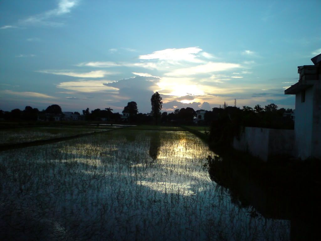 हल्द्वानी में डूबते हुए सूरज और धन के खेत में पानी का विहंगम द्रश्य........
