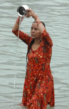 हरकी पैड़ी पर स्नान कर जल का अर्घ्य देती महिला।