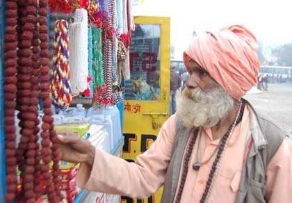 ऋषिकुल बस अड्डे पर रुद्राक्ष की माला देखता साधु।