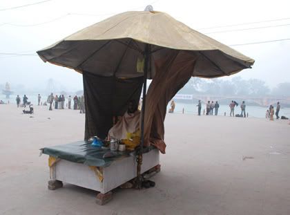 हरकी पैड़ी पर कड़ाके की ठंड में जजमानों के इंतजार में बैठा पंडित।