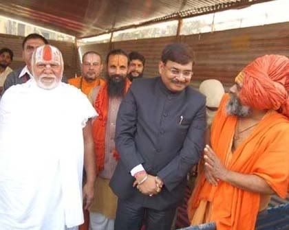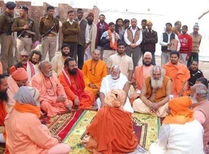 अखाड़ों की धर्मध्वजा स्थापित करते समय मायादेवी मंदिर परिसर में आयोजित बैठक में भाग लेते अखाड़ा परिषद के अध्यक्ष महंत ज्ञानदास व अन्य।