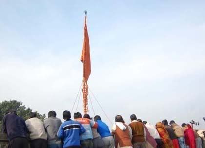 आनंद अखाड़े में धर्मध्वजा स्थापित करने के लिए उमड़ी संतों की भीड़।