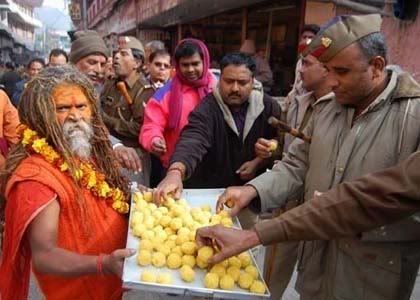 आनंद अखाड़े में धर्मध्वजा स्थापित करने के बाद श्रद्धालुओं को प्रसाद बांटता एक साधु।