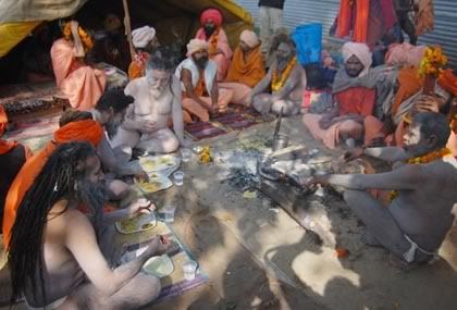 ज्वालापुर पांडेवाला में पेशवाई से पहले नागा साधु भोजन ग्रहण करते हुए।