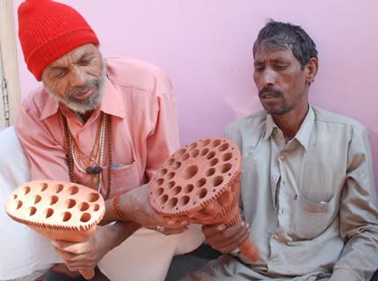 कुंभ नगरी में साधु को चिलम दिखाता कुम्हार।