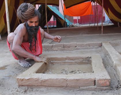 जूना अखाड़ा में धूनी के लिए कुंड तैयार करता साधु।