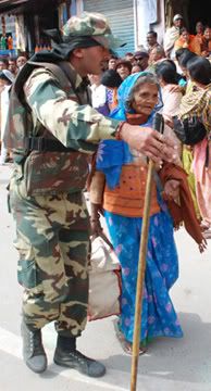 इधर से जाओ धर्मनगरी में एक वृद्ध महिला को रास्ता बताता सुरक्षा बल का जवान।