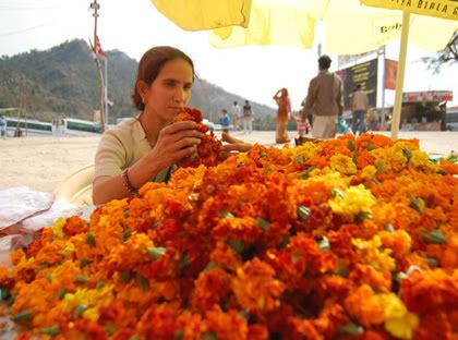 श्रद्धा के फूल पायलट बाबा के आश्रम के बाहर फूल बेचती महिला।