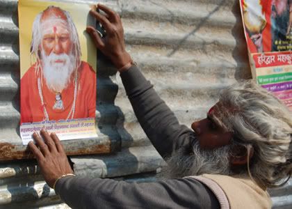 गुरु का पोस्टर महामंडलेश्वर नगर में अपने गुरु का पोस्टर लगाता साधु।