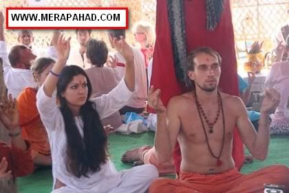 आस्था नीलधारा स्थित पायलट बाबा के आश्रम में यज्ञ के दौरान भाग लेते विदेशी युवक-युवतियां।