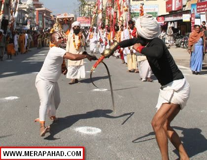 करतब श्री पंच दिगंबर अणी अखाड़े की पेशवाई के दौरान तलवारबाजी के करतब दिखाते वैरागी संत।