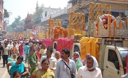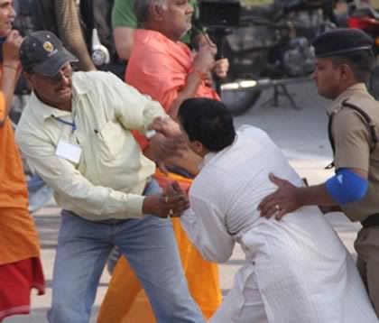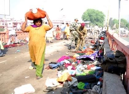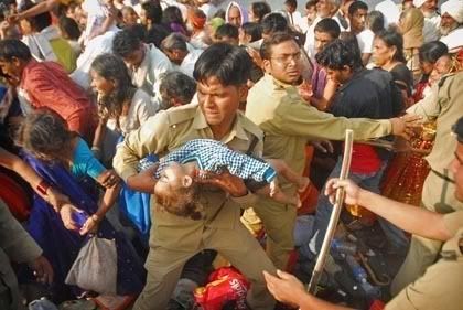 महाकुंभ के अंतिम शाही स्नान के दिन बुधवार, 14 अप्रैल को धर्मनगरी में श्रद्धालुओं का ऐसा सैलाब उमड़ा कि तगड़े सुरक्षा प्रबंध होने के बावजूद अनहोनी टाली नहीं जा सकी। इस दौरान बिरला घाट के पास मची भगदड़ में आठ श्रद्धालुओं की मौत हो गई। भगदड़ के दौरान एक बच्चे को बचाता सुरक्षाकर्मी।